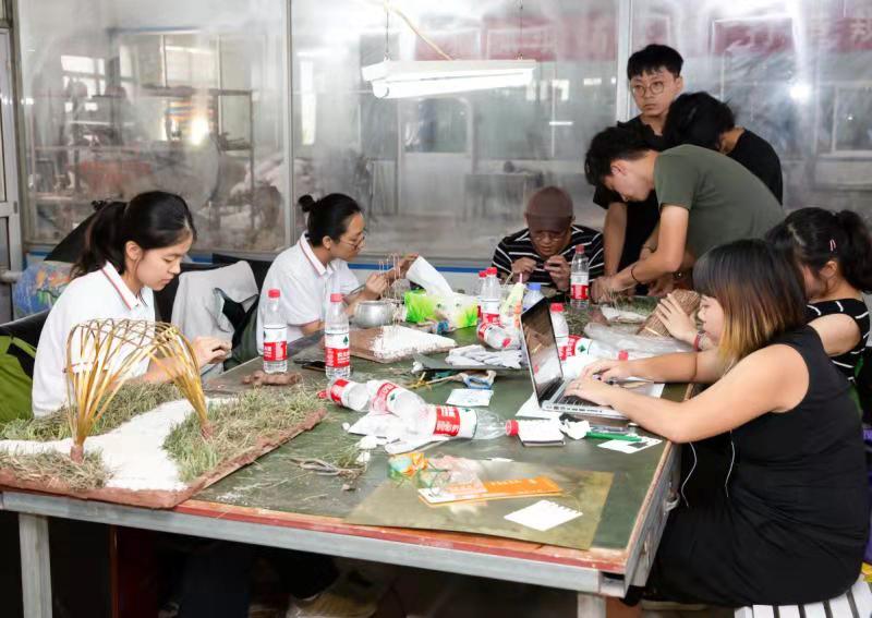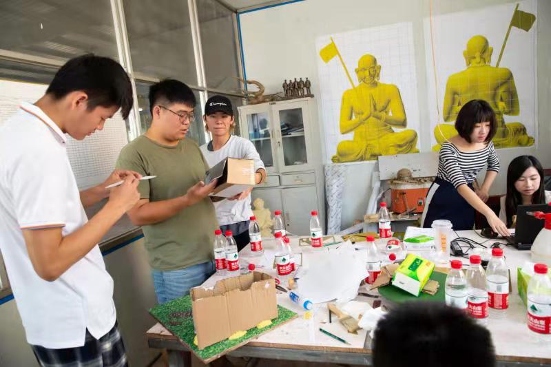 老師與學生們分組討論對銅藝小鎮(zhèn)局部改善的方案