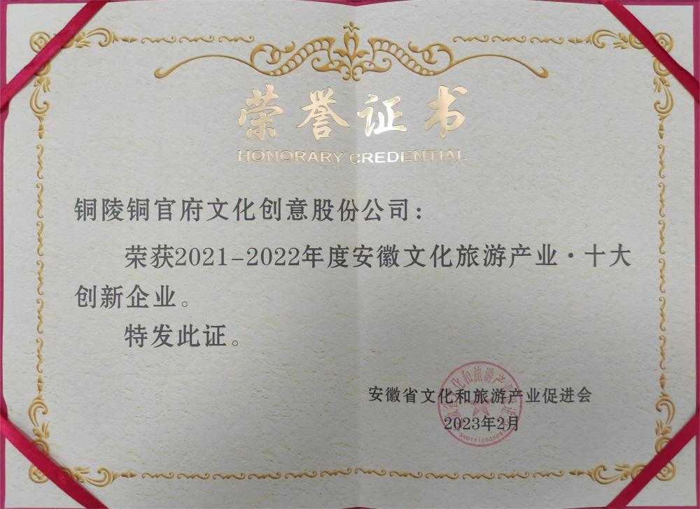 日前,由安徽省文化和旅游產業(yè)促進會(省文促會)主辦的第二屆安徽文化旅游產業(yè)2021-2022年度頒獎盛典暨新春聯(lián)誼會活動在合肥舉行,2021-2022 年度“七個十”榜單公布。銅陵銅官府文化創(chuàng)意股份公司榮獲“2021-2022年度安徽文化旅游產業(yè) · 十大創(chuàng)新企業(yè)”,公司創(chuàng)始人趙敏榮獲“2021-2022年度安徽文化旅游產業(yè) · 十大榜樣人物”。